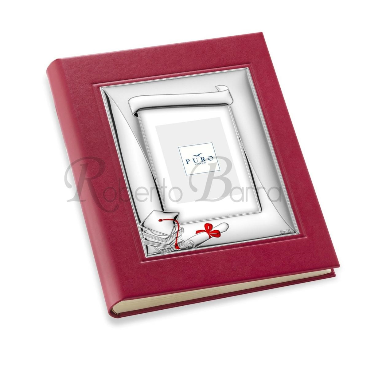 ALBUM FOTO LAUREA IN ECOPELLE ROSSA PURO ARGENTI CM 25X30 CON CORNICE PORTAFOTO CM 13X18 IN ARGENTO PVD CON DETTAGLI SMALTATI.