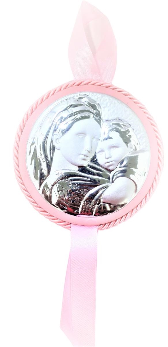 CAPOCULLA MUSICALE TONDO IN PELLE ROSA CM 9.5 ALEXIA ARGENTI CON CON PLACCA MADONNA CON BAMBINO IN ARGENTO PVD .