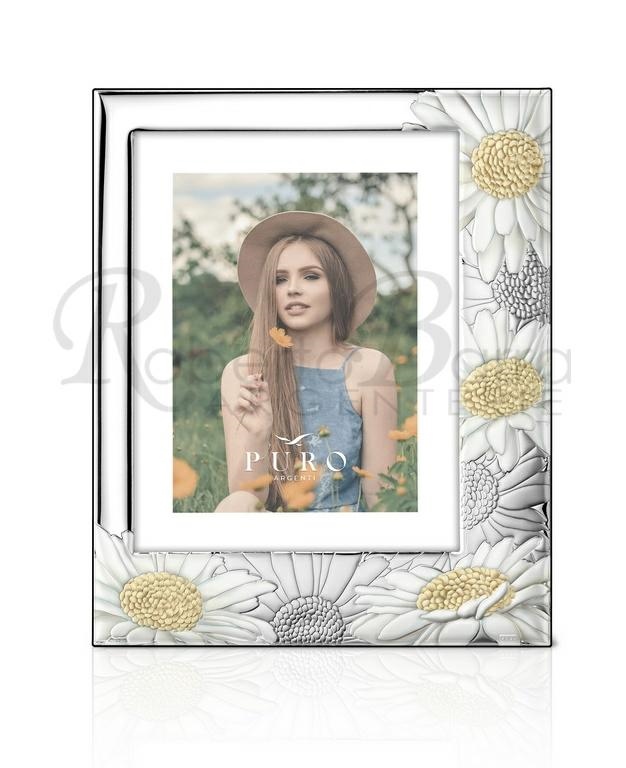 CORNICE PORTAFOTO PURO ARGENTI LINEA "TEIKI" CM 15X20 IN ARGENTO PVD CON MARGHERITE SMALTATE. RETRO IN LEGNO WENGE' NATURALE.