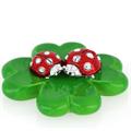 COCCINELLA DOPPIA ROSSA CON PUNTINI ARGENTATI IN RESINA CM5.5 LEONARDO ARGENTI SU BASE QUADRIFOGLIO IN CERAMICA VERDE CM 10 .