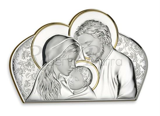 ICONA ATELIER SACRA FAMIGLIA CM 10X15 IN ARGENTO PVD CON INSERTI DORATI, RETRO IN LEGNO.